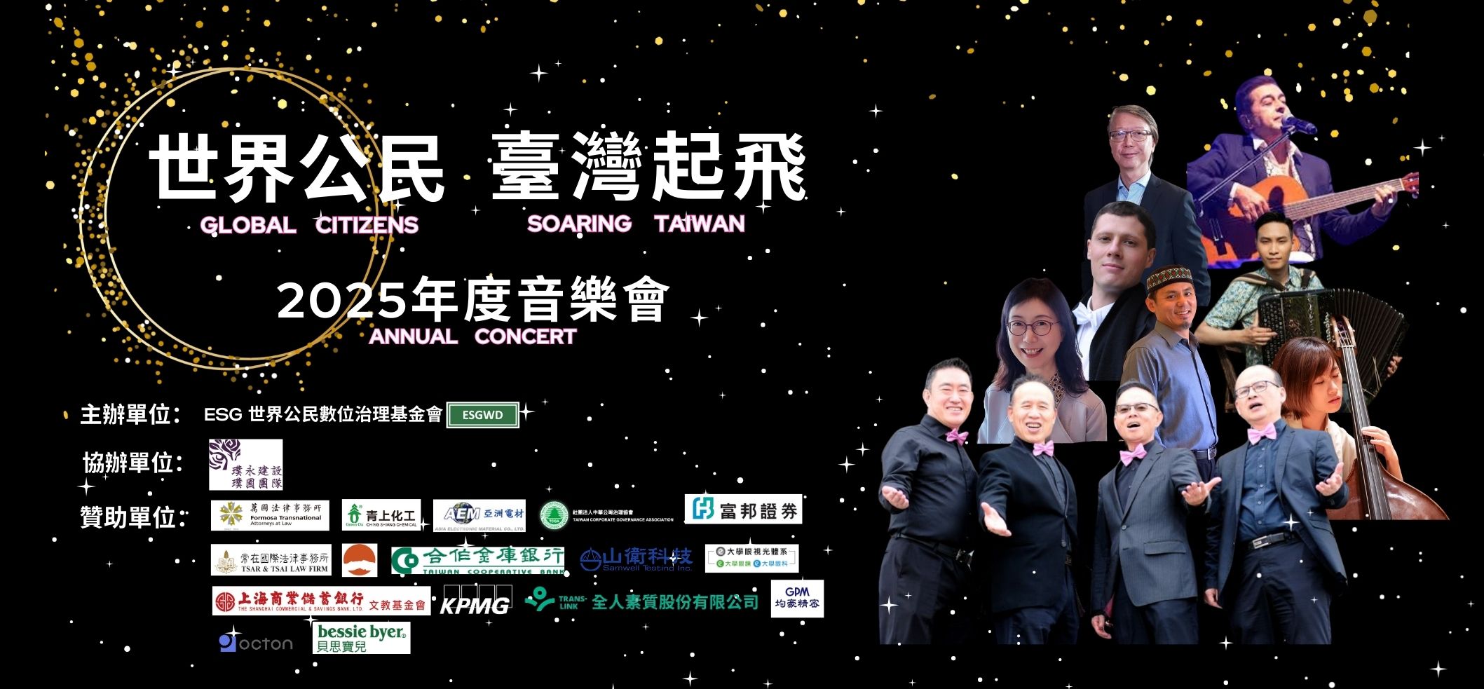 由 ESG 世界公民數位治理基金會主辦的「2025 世界公民臺灣起飛-年度音樂會」於9月14日在誠品表演廳舉行。此次音樂會邀請到知名樂團 The Gallic Quintet 與肝連公民男聲合唱團,以美妙音符打造一場藝術與永續融合的盛會,進而傳遞良善世界公民的理念。