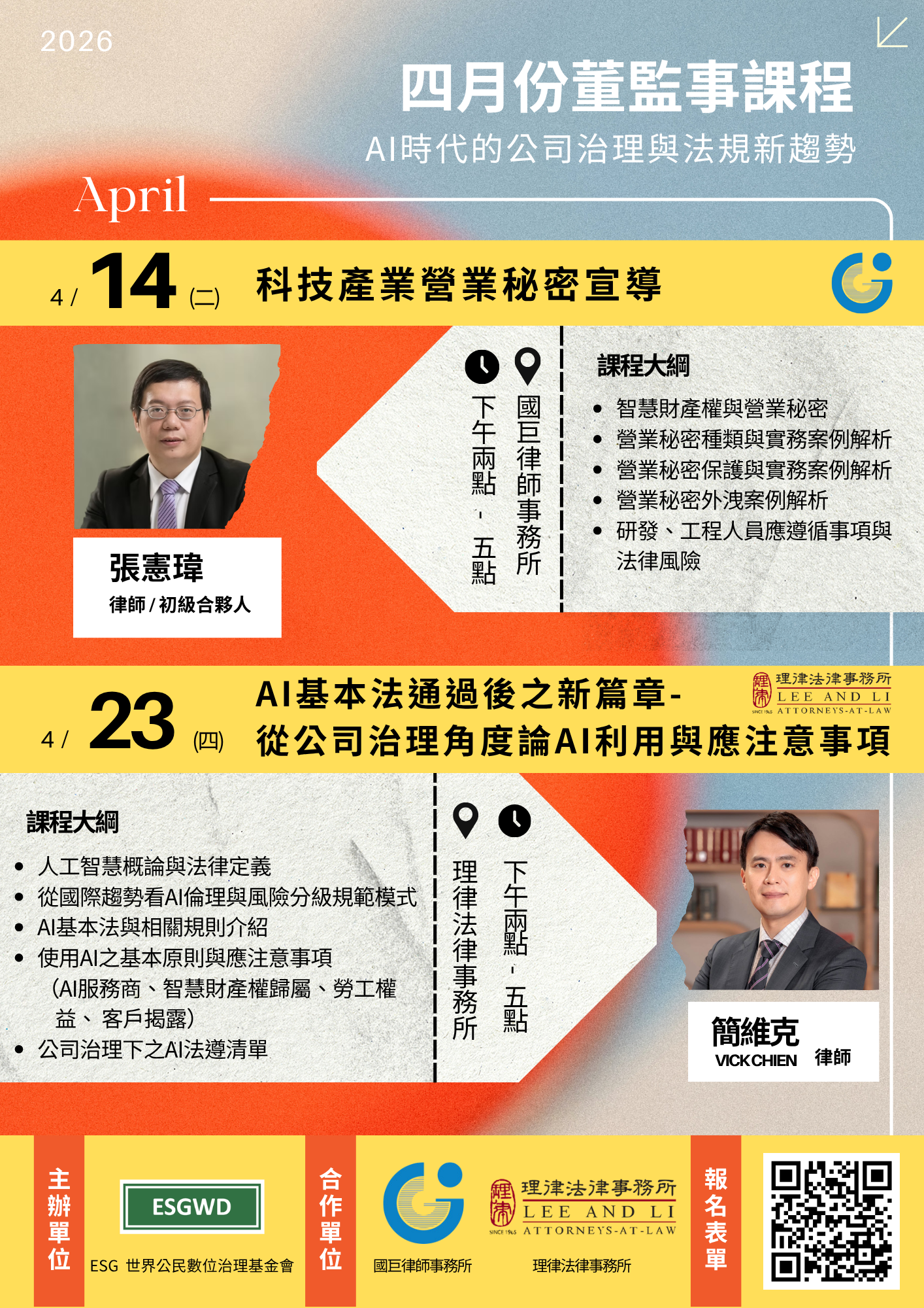 立即報名|四月董監事與公司治理主管認證課程:AI治理與營業秘密解析2026.3.24在 AI 技術快速發展與法規持續演進的 2026 年,企業在公司治理、營業秘密保護及 AI 應用上,正面臨前所未有的挑戰與風險。為協助董事與高階經理人掌握最新趨勢,本會特別規劃「四月份董事監事專題課程」,結合法律與實務觀點,強化企業治理韌性。 報名連結: https://forms.gle/cxTmJM9GoezEU11r7 https://esgwd.org/wp-content/uploads/2026/03/4月公開董事課程-edm-.png 2000 1414 service /wp-content/uploads/2024/06/logo-color.png service2026-03-24 12:00:382026-03-24 12:02:11立即報名|四月董監事與公司治理主管認證課程:AI治理與營業秘密解析